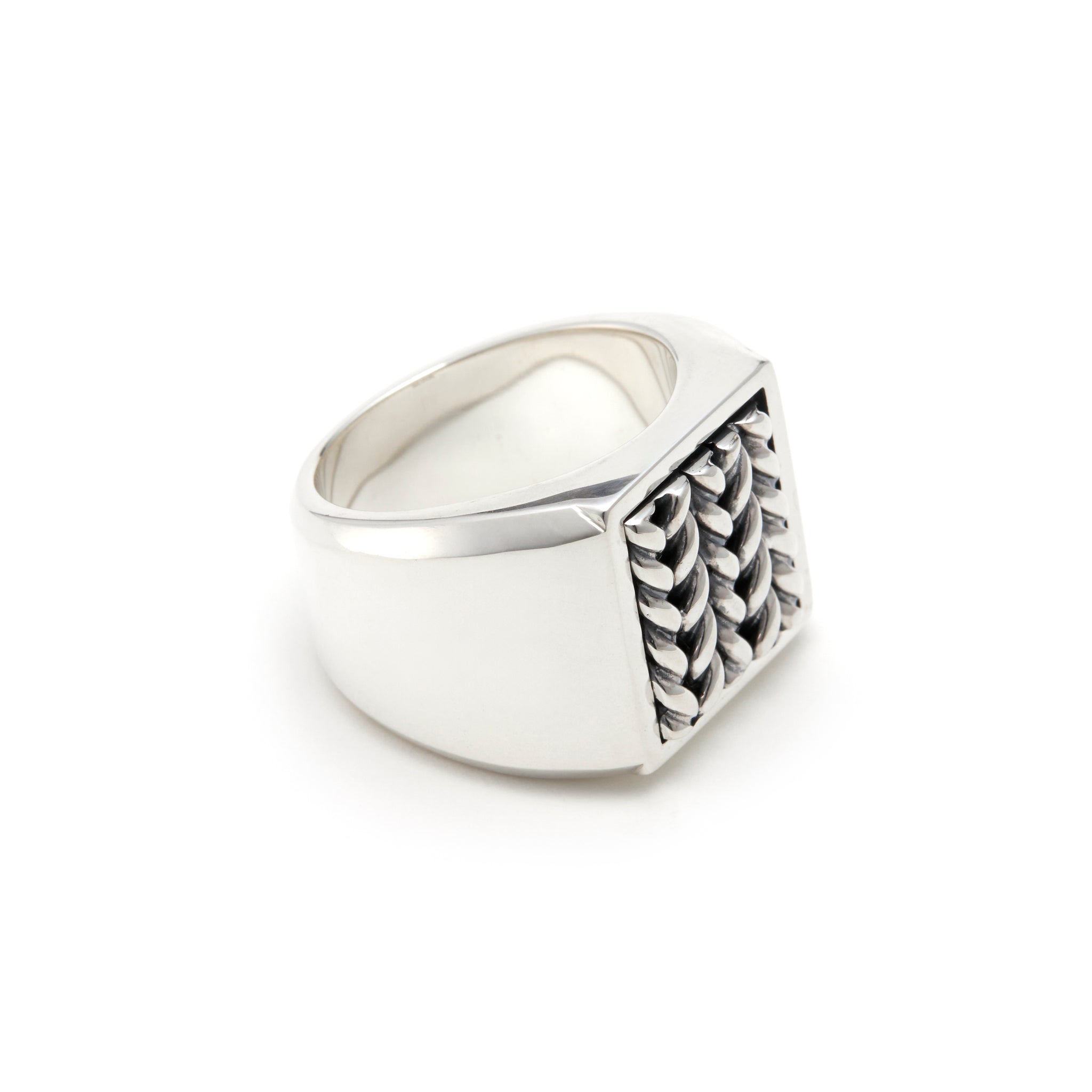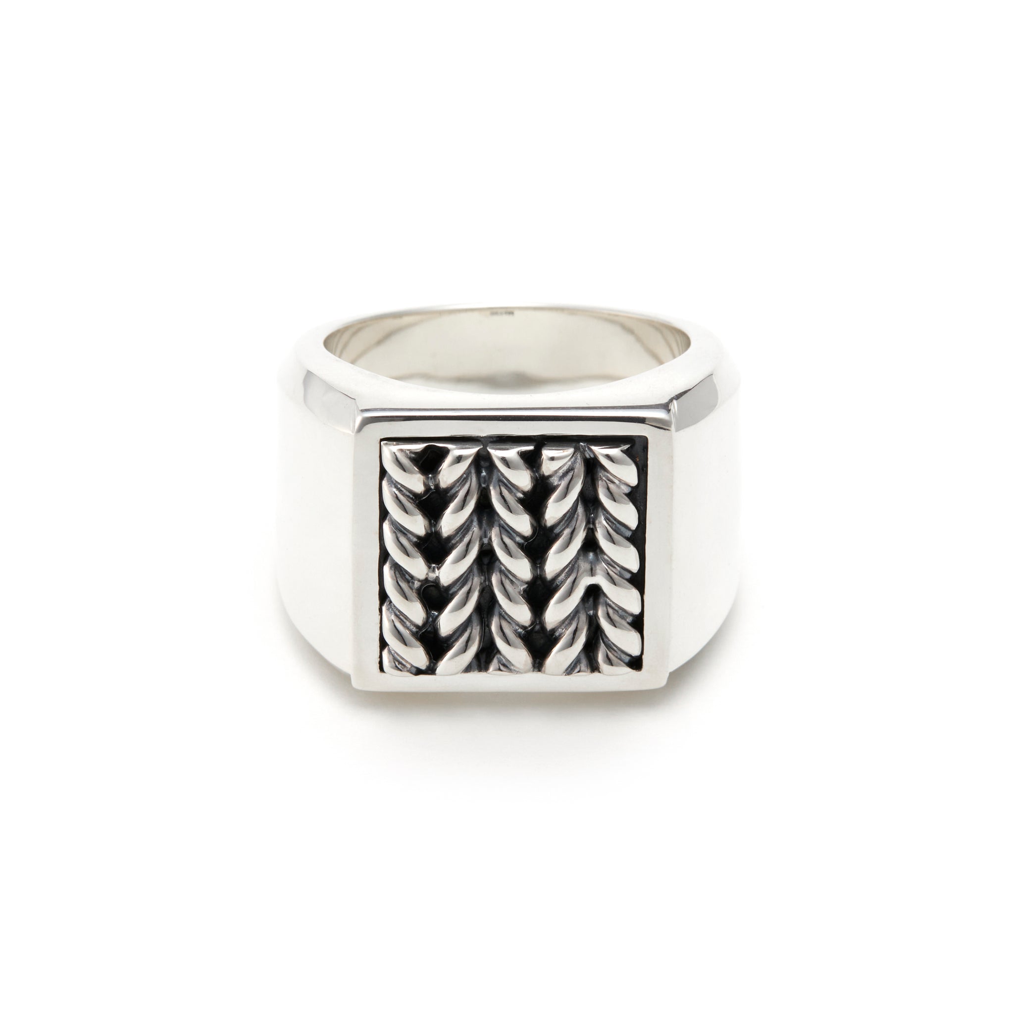 やや大ぶりなスクエアトップながら繊細なエッジラインとシルバー素材らしい燻しがクラフト感の薫る印象的なモチーフアクセントを組み合わせた指馴染みよく大胆な存在を醸す仕立てとしたリング